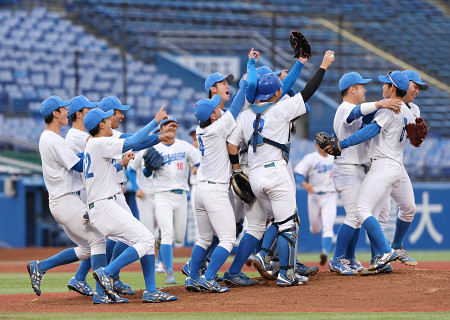 東都大学野球秋季リーグ戦最終週最終日は24日、神宮球場で3回戦2試合が行われ、青学大が6季連続18度目の優勝を決めた。写真は青学大ナイン。 【時事通信社】