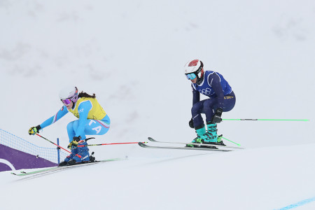 フリースタイルスキーは20日、女子スキークロスが行われ、中西凜、向川桜子、新井真季子は1回戦で敗退した。写真は中西(右)の滑走=リビーニョ 【時事通信社】