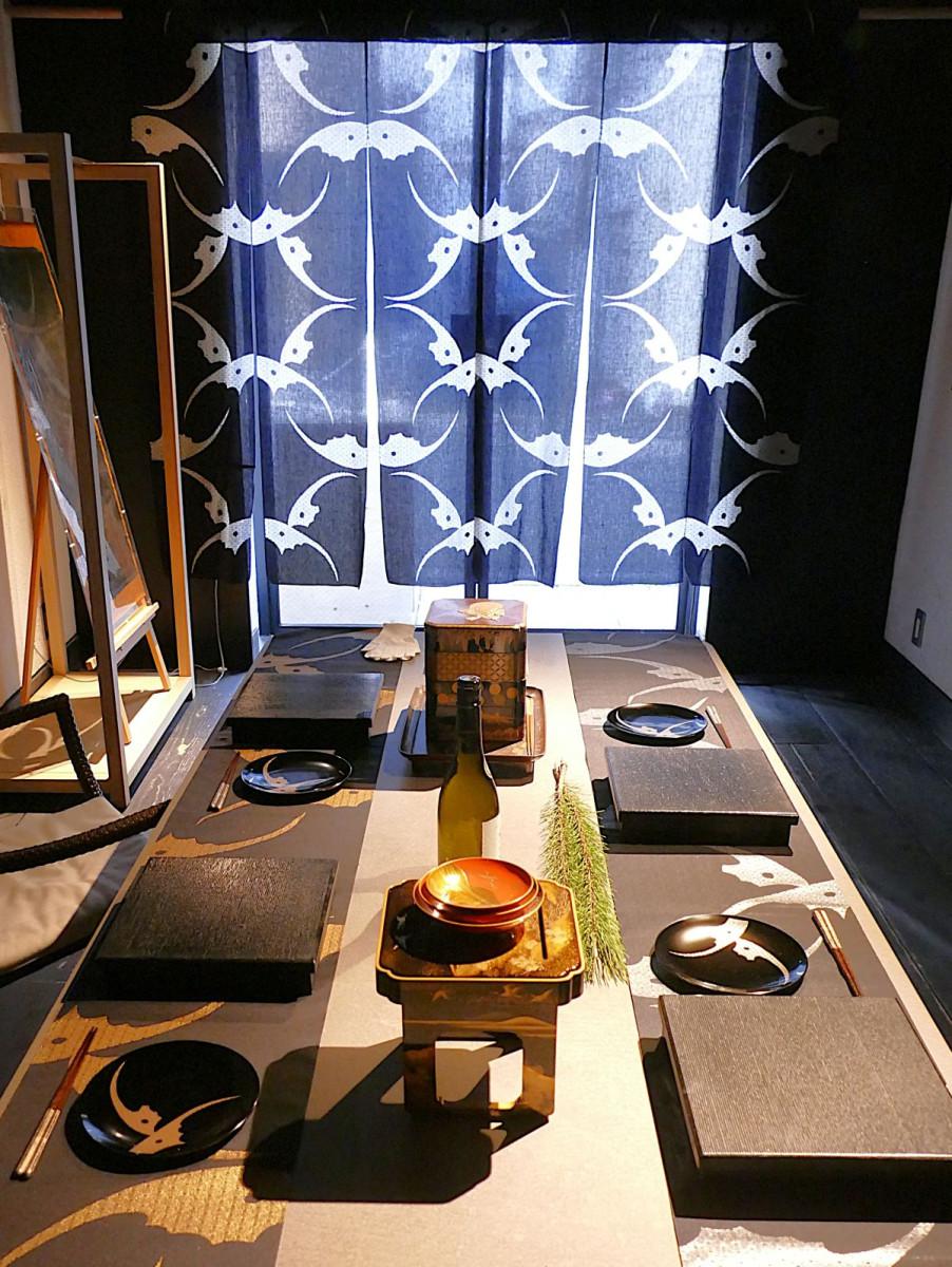 企画展「三勝謹製 新しい和のかたち展―ゆかた意匠をアートとライフスタイルへ再解釈―」が12月15日、ゆかた問屋「三勝(さんかつ)」(中央区日本橋人形町3)の本社ビル前にある「百年ギャラリー」1階~3階で始まった。