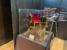 日本橋企業「ispace」のブースでは開発中の「シリーズ3ランダー(仮称)」の5分の1スケールモデルを展示。ペイロード積載可能容量が30キロから数百キロにスケールアップする