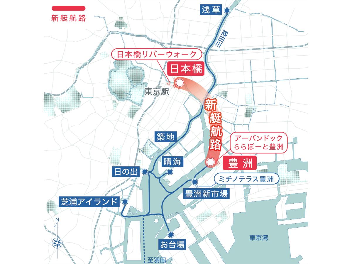 4月初旬に就航予定で、「日本橋船着場」(日本橋1)と「三井ショッピングパークアーバンドックららぽーと豊洲(以下、ららぽーと豊洲)」(江東区)間を片道20分で結ぶ