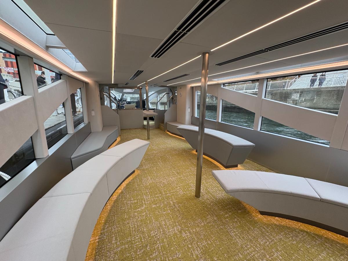 300kwのリチウムイオン電池を搭載した静かな船内は、移動の心地よさを整えた内装。フリーWi-Fiやコンセントを備える