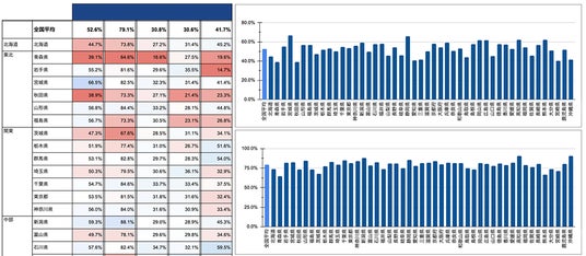 5大がんについて、早期(Stage I+II)で診断された患者の割合を都道府県別に可視化し、地域ごとの傾向を集計したところ、全国平均で「