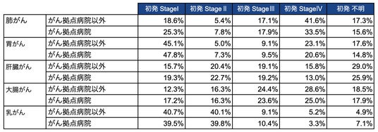 がん拠点病院と拠点病院以外で、5大がんの初発病期構成(Stage I~IV・不明)を比較。拠点病院は肺・胃・肝・大腸でStage I比率が高くStage IVと不明が低い傾向がみられる一方、乳がんは早期比率が同程度で不明率が拠点病院側で高いなどの傾向がみられました。