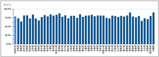 乳がんの早期(Stage I+II)割合は全国平均79.1%と、5大がんの中で最も高水準でした。多くの都道府県で高い割合を示し、80%台後半~90%台に達する県も見られる一方、青森64.6%、熊本66.4%、茨城67.6%など一部で低い県が確認できます。