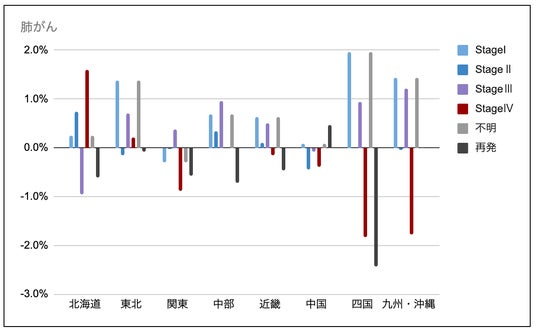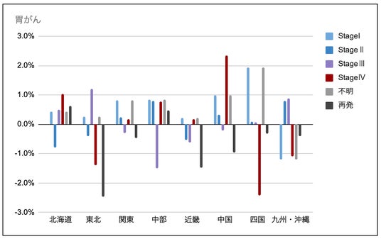 胃がんは地域により差が出ており、四国地方はStage Iが+1.9pt、Stage IVが-2.4ptと早期割合が増加。中国地方はStage IVが+2.4pt(Stage Iも+1.0pt)で進行期の伸びが目立つ。再発は概ね減少で、東北地方-2.5pt、近畿地方-1.5ptが大きい一方、北海道は+0.6ptと微増。
