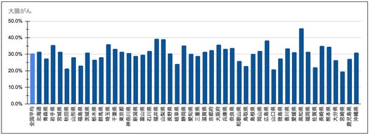 胃がん52.6%、乳がん79.1%、肺がん30.8%、大腸がん30.6%、肝がん41.7%」となりました。(胃がん、肺がん、肝がんについては、